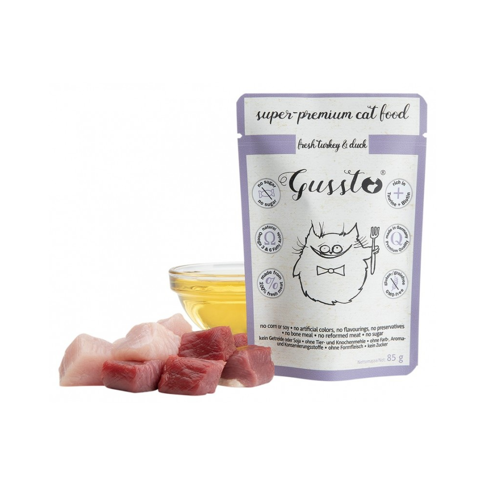 Pełnoporcjowa karma mokra klasy superpremium dla kotów, przygotowana z wysokiej jakości świeżego mięsa indyka i kaczki. Starannie opracowana receptura dostarcza wszystkich niezbędnych składników odżywczych, wspierając zdrowie, prawidłowe funkcjonowanie organizmu oraz codzienną witalność kota.