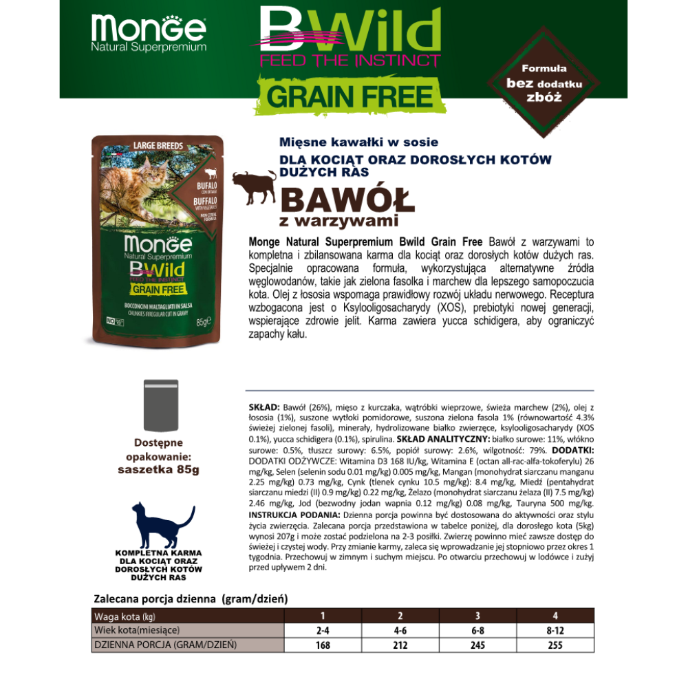Monge Natural Superpremium BWild Grain Free Bawół z warzywami to pełnoporcjowa, bezzbożowa karma mokra w sosie, przeznaczona dla kociąt oraz dorosłych kotów dużych ras. Receptura została opracowana z myślą o specyficznych potrzebach żywieniowych większych kotów, zapewniając im energię, prawidłowy rozwój i dobre samopoczucie każdego dnia.