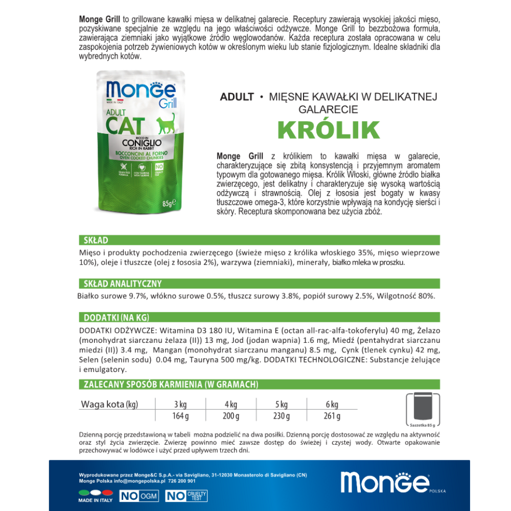 Monge Natural Superpremium Grill Cat Adult Królik to pełnoporcjowa, bezzbożowa karma mokra klasy superpremium, przeznaczona dla dorosłych kotów. Delikatnie pieczone kawałki mięsa odpowiadają naturalnym potrzebom żywieniowym kota, dostarczając mu wysokiej jakości białka oraz doskonałych walorów smakowych.