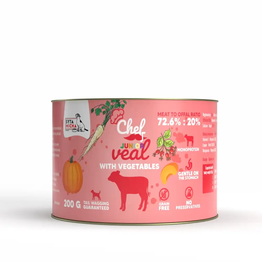 Mokra karma dla psa cielęcina z warzywami JUNIOR 200 g – pełnoporcjowy posiłek dla szczeniąt