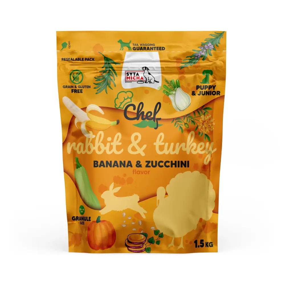 Syta Micha – sucha karma dla szczeniąt Królik i indyk, banan i cukinia 1,5 kg
